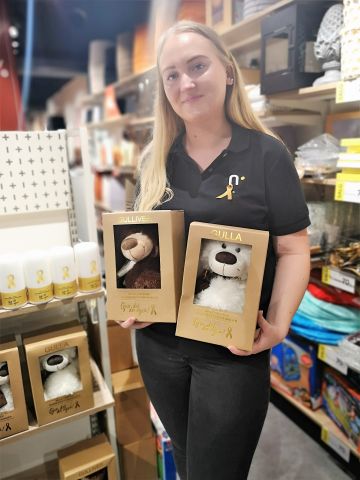 – Kunder som går med barnevogn kjøper gjerne litt ekstra, sier Kristine og smiler lurt mens viser frem de søte bamsene Gulla og Gulliver.